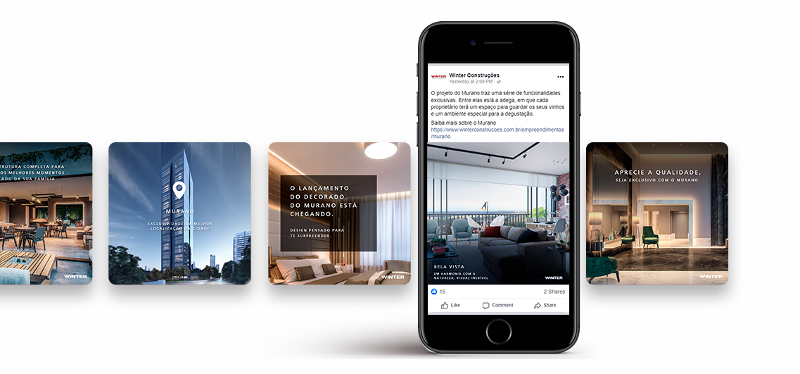 Para salientar toda a grandeza e luxo dos imóveis construídos pelo cliente nas plataformas digitais, nossa equipe de conteúdo e design apostou em um conceito trazendo toda a sofisticação e elegância, que refletem os principais pontos dos empreendimentos Winter.